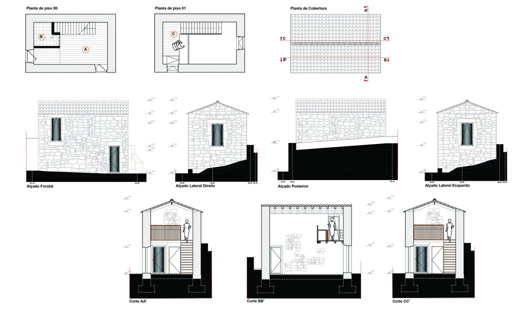 The main intention of the project was to preserve the existing characteristics of the “atafona,” such as the visible basalt stone masonry on the exterior. It was necessary to increase the height of the building to meet the minimum ceiling height requirements.