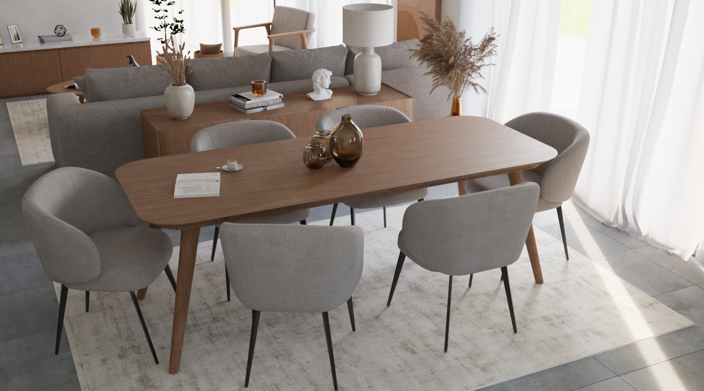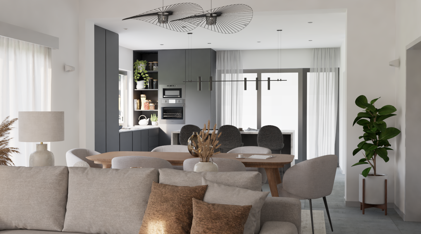 The living and dining room showcase excellent space integration, with a gray sofa in the foreground, the dining area in the background, and high ceilings with exposed beams. It’s a cozy space, featuring cushions in earthy tones and a wooden coffee table with decorative objects.