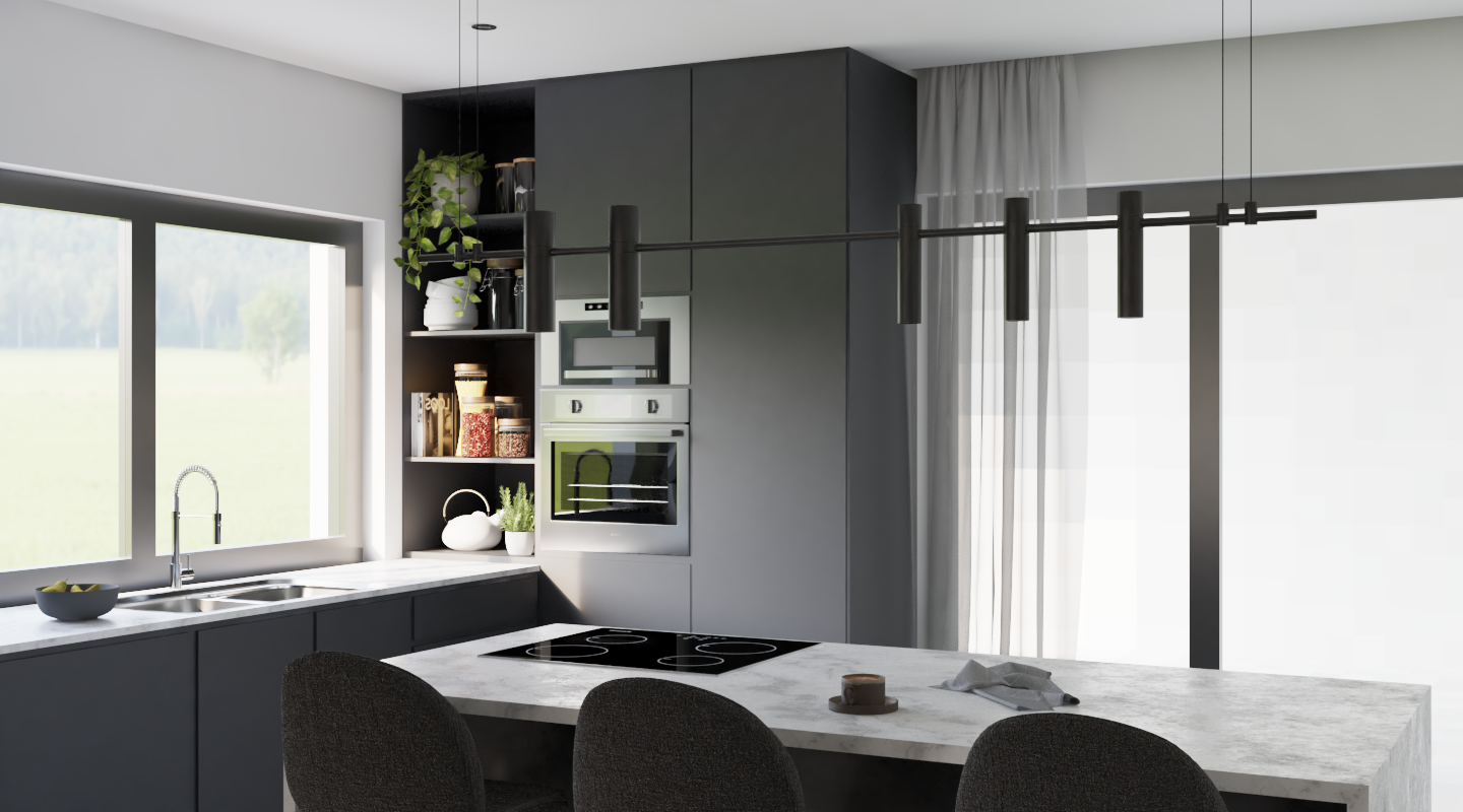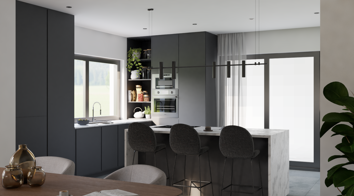 The kitchen, featuring a large window that illuminates the space, has dark gray matte-finish cabinets, a Dekton countertop – an ultra-compact porcelain surface with a marble pattern – and built-in appliances.