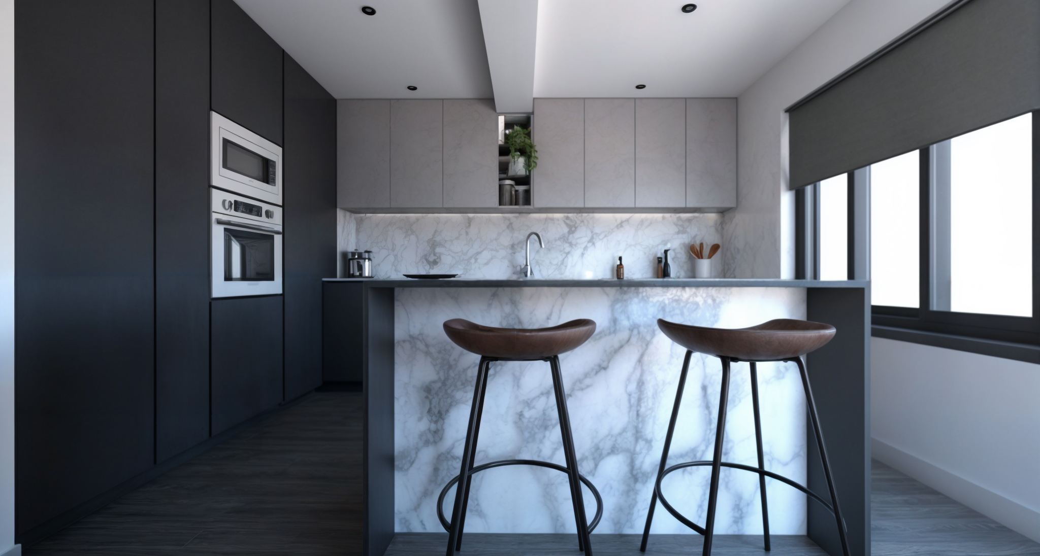 It features light gray upper cabinets and dark lower cabinets. The countertop is made of Dekton, an ultra-compact porcelain surface, in this case with a white marble pattern and gray veining.