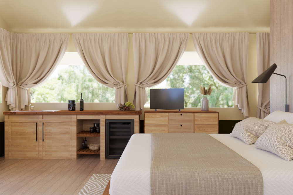 The incorporation of vegetation is of paramount importance in this project. It acts as a natural organizer, guiding visitors along pathways while also establishing intimate and secluded spaces adjacent to the glamping tents. This thoughtful integration of greenery enhances the overall experience and aesthetics of the camping site.