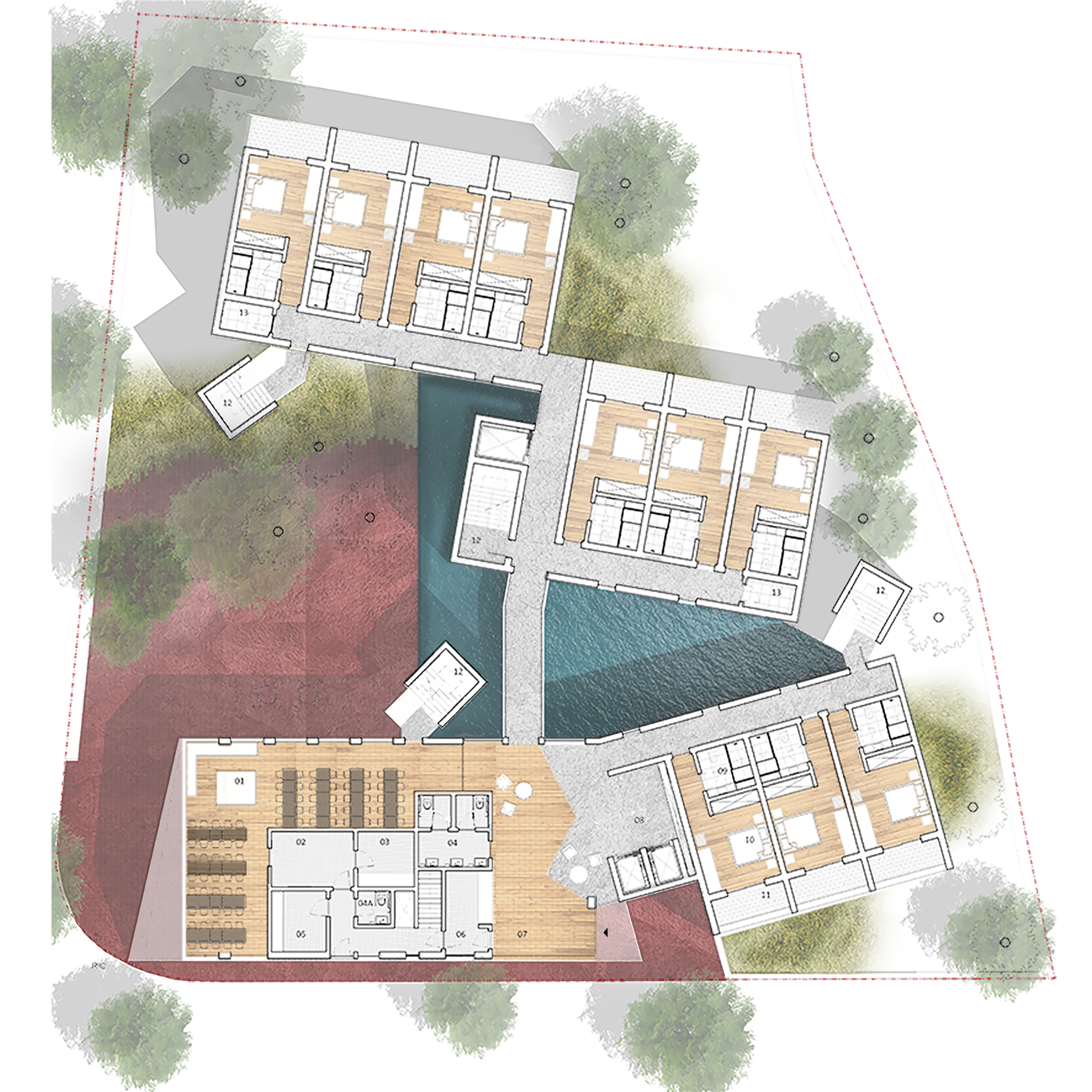 Furthermore, the garden serves as a buffer between the more social areas, which have connections to the exterior, and the zones where the rooms are situated. This ensures that guests staying in the rooms can enjoy a peaceful environment without being disturbed by potential noise from the social areas.